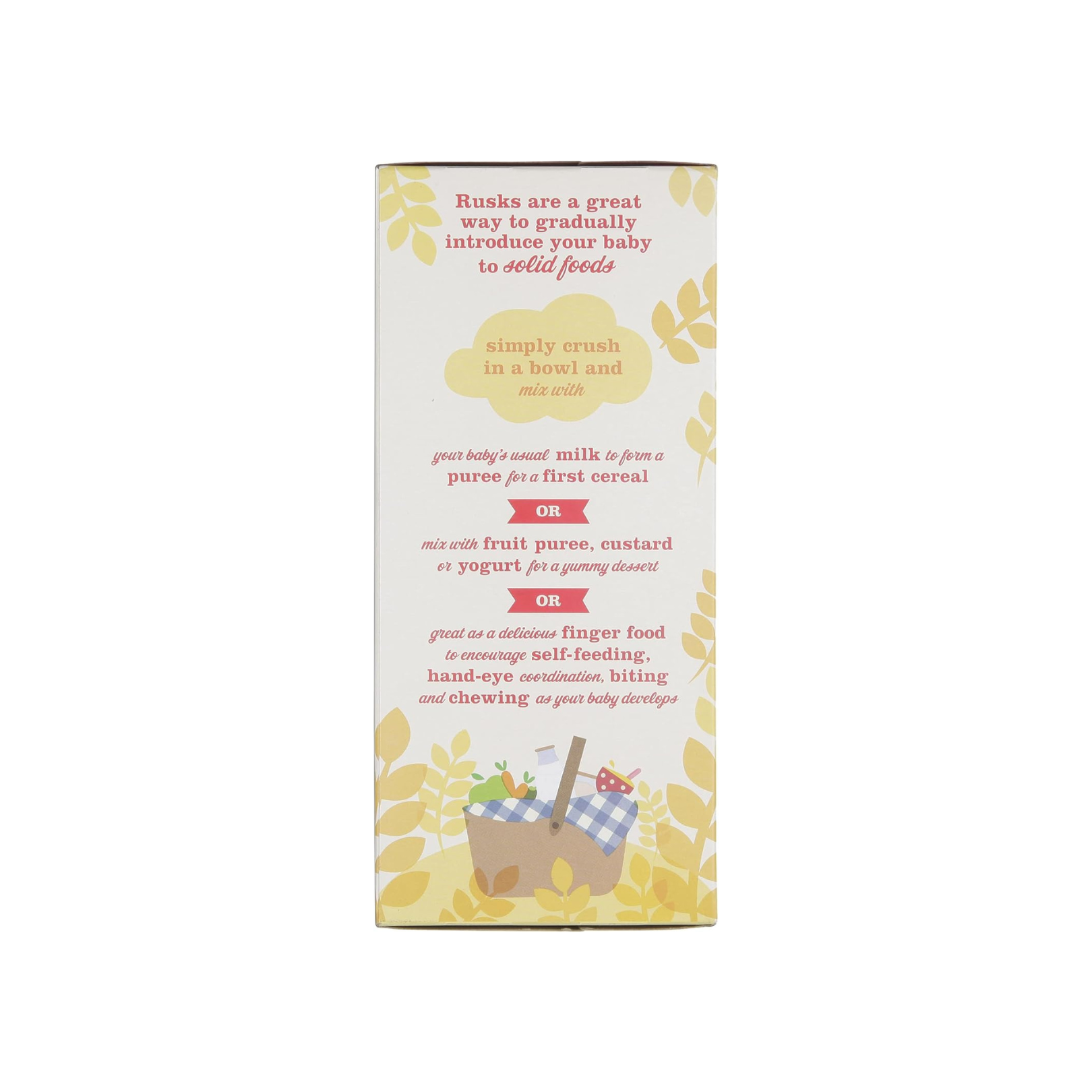 Rusks are a great way to gradually introduce your baby to solid foods. Simply crush in a bowl and mix with your baby's usual milk to form a puree for a first cereal. OR mix with fruit puree, custard or yogurt for a yummy dessert. OR great as a delicious finger food to encourage self-feeding, hand-eye coordination, biting and chewing as your baby develops. Safety at meal times. Always make sure that a responsible person is present when your baby is feeding. Your Health Visitor or Doctor can advise you on infant feeding. REMEMBER TO BRUSH TEETH REGULARLY. USE AS PART OF A VARIED WEANING DIET.